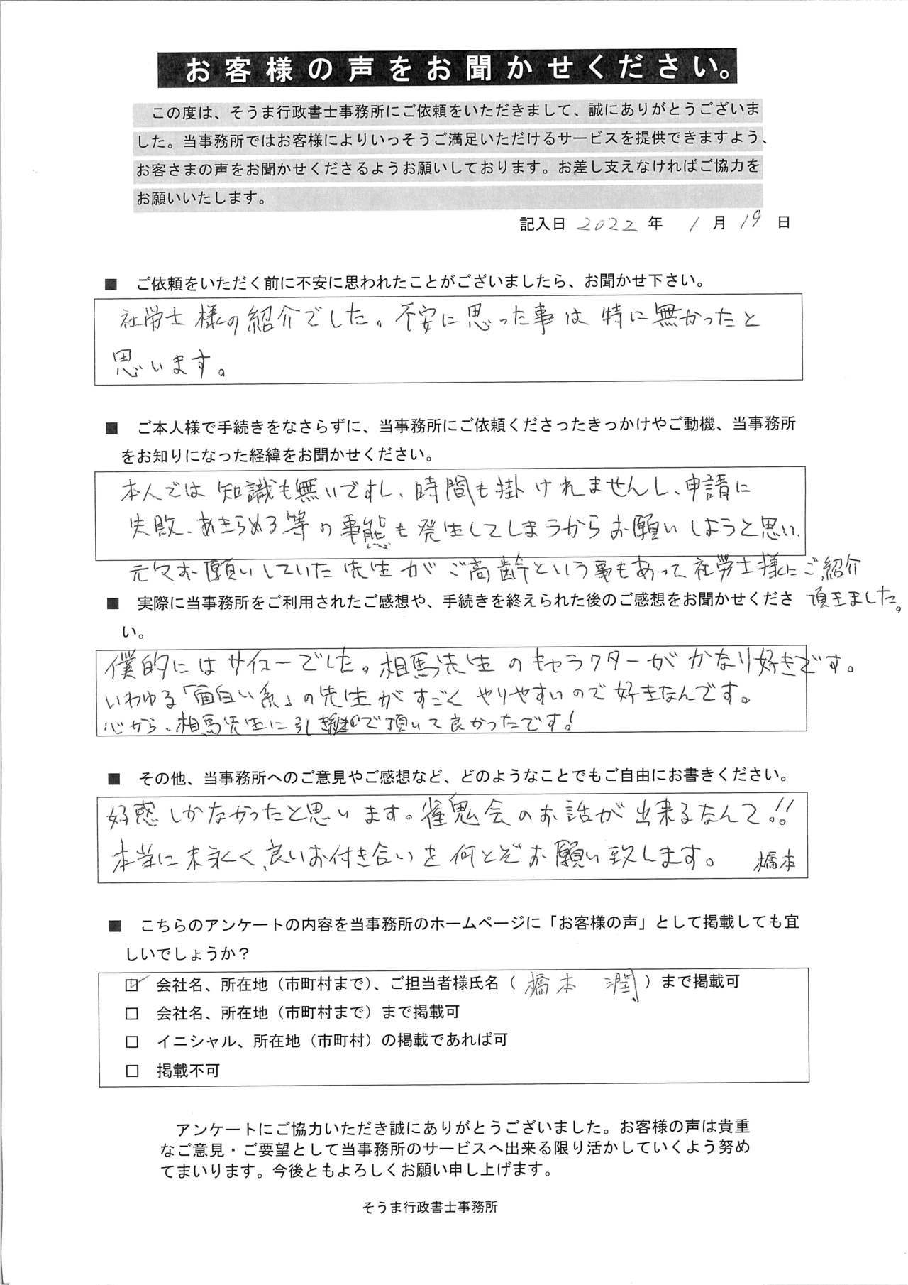 とても親切な説明で、こちらの都合にも気持ちよく合わせて頂きスムーズに書類等、提出することができました。本当に安心して任せられる行政書士に出会えたと思います。