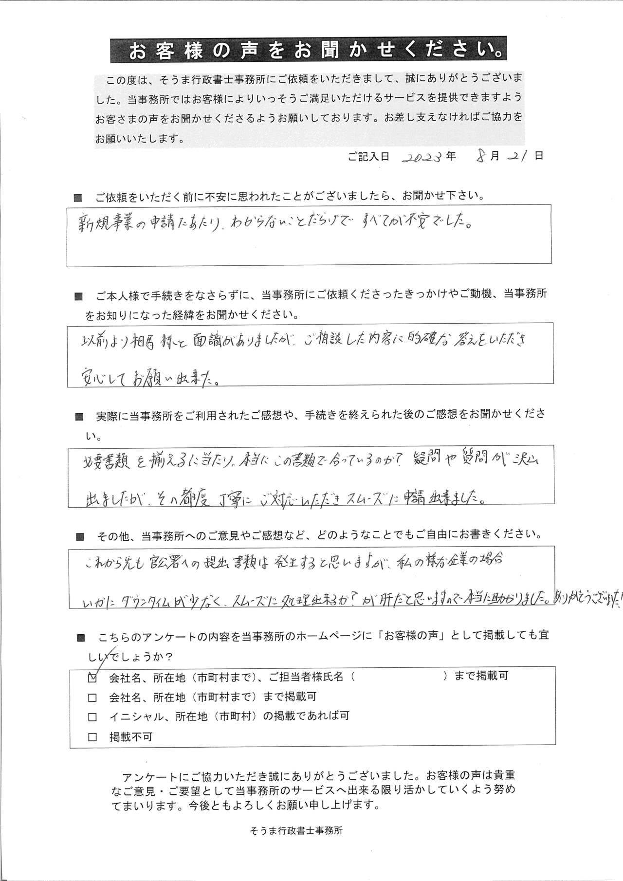 社会新規事業の申請にあたり分からないことだらけですべてが不安でした。