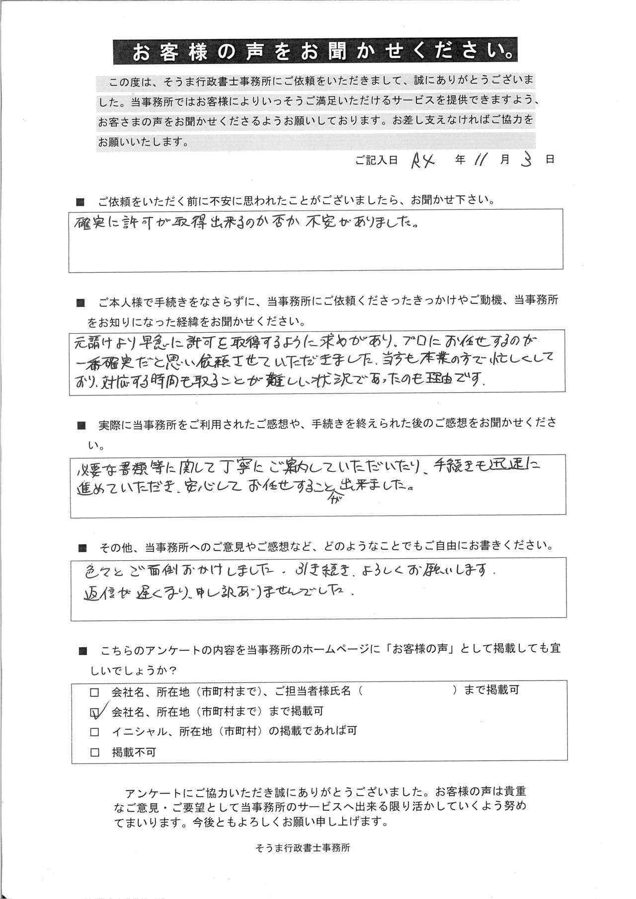当初、横浜の行政書士事務所と連絡をとっていましたが、仕事の休み、打合せなどの調整ができず、また遠方ということもありあきらめていました。貴社を知りもう1度取得してみようと思いご連絡してみました。